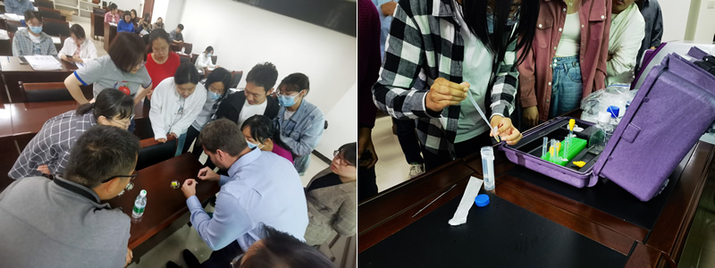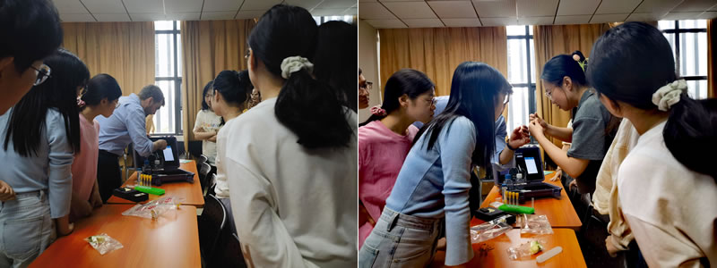 在華中農(nóng)業(yè)大學(xué),有棉花、小麥、番茄和水稻課題組10多位老師和學(xué)生參加講座。通過(guò)花粉樣品的現(xiàn)場(chǎng)測(cè)試,并上機(jī)操作,參會(huì)老師和同學(xué)對(duì)花粉活力分析儀的測(cè)試速度和結(jié)果很滿意,并對(duì)儀器的便攜性稱贊有加。針對(duì)希望能推出新物種專用芯片的問(wèn)題,瑞士Amphasys公司的代表Lluc也做出了積極回應(yīng)。