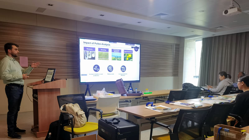 在河南省農(nóng)業(yè)科學(xué)院,講座主要結(jié)合Z40花粉活力分析儀進(jìn)行。農(nóng)科院園藝所蔬菜組、梨研究組、花卉研究組、糧食作物研究所、農(nóng)科院基地管理中心的30位科研人員及學(xué)生參加了此次講座,此外,該場(chǎng)講座還開(kāi)通了線上會(huì)議,重慶市風(fēng)景園林科學(xué)研究院、河南農(nóng)業(yè)大學(xué)等單位的老師在線上進(jìn)行了留言咨詢。講座現(xiàn)場(chǎng)測(cè)試了大白菜、芍藥及番茄等多種花粉樣品,各位老師均對(duì)測(cè)量結(jié)果表示滿意。