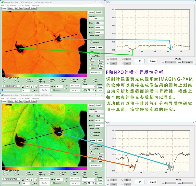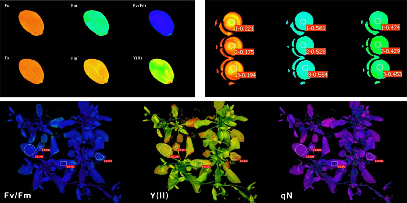 IMAGING-PAM 具有 MAXI、MINI、MICROSCOPY 等三個(gè)不同版本,用于測(cè)量高等植物和藻類(lèi)葉綠素?zé)晒???蓪?duì)Ft、Fo、Fm、Fv/Fm、F、Fm’、Y(II)、Y(NO)、Y(NPQ)、NPQ、qN、qP、qL、ETR、Abs.、NIR、Red 等至少 17 種參數(shù)進(jìn)行成像分析。