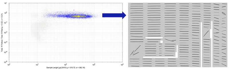 CytoSense分析顯示大量藻華細(xì)胞為絲狀體,在散點(diǎn)圖形成一個(gè)簇。經(jīng)檢測(cè)樣品濃度為6.5*104/ml,平均長(zhǎng)度為315μm。