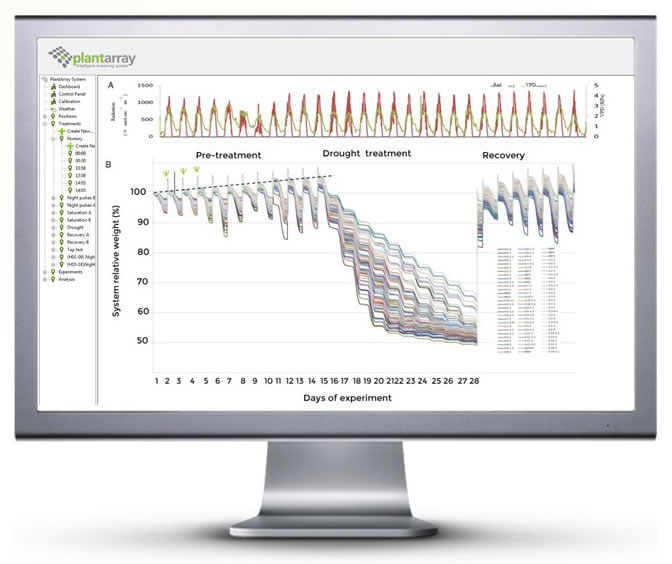 以色列Plant-DiTech公司的Plantarray監(jiān)測(cè)系統(tǒng)是一套高通量,以植物生理學(xué)為基礎(chǔ)的高精度表型系統(tǒng),可以完成整個(gè)植物生長(zhǎng)周期中不同環(huán)境下的SPAC(Soil-Plant-Atmosphere Continuum, 土壤植物大氣連續(xù)體)因子的測(cè)量。連續(xù)不間斷的獲取陣列內(nèi)所有植物的監(jiān)測(cè)數(shù)據(jù),實(shí)時(shí)監(jiān)控和及時(shí)調(diào)整每個(gè)培養(yǎng)容器中的土壤條件,包含土壤水分、鹽分。