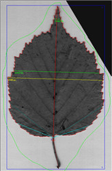 葉子測(cè)量參數(shù):葉面積(單個(gè)和總的),葉子穿孔面積(單個(gè)和總的),葉子長(zhǎng)度,葉周長(zhǎng),葉最大寬度、平均寬度,縱橫比,形狀因子。