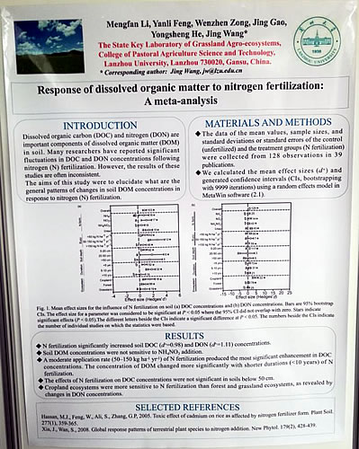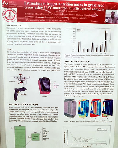 墻報交流以蘭州大學(xué)的研究成果為主,也有青海大學(xué)、寧夏大學(xué)、四川省草原科學(xué)研究院、南京農(nóng)業(yè)大學(xué)、西南民族大學(xué)、中山大學(xué)等單位的研究成果。30多份墻報中,有兩份綜述類墻報、兩份方法類墻報具有代表性。綜述類墻報:蘭州大學(xué)草業(yè)學(xué)院Zhenxia Li等以題“The methods to eliminate endophyte of grasses seeds, a review”,展示了內(nèi)生真菌的研究方法;:蘭州大學(xué)草業(yè)學(xué)院Yongsheng He等以題“Response of dissolved organic matter to nitrogen fertilization: A meta-analysis”,展示了施氮對可溶性有機碳的影響。方法類墻報:四川省草原科學(xué)研究院Yu Zhang等以題“The establishment of model for Nutritional Quality in Chicory by Near-infrared Spectroscopy (NIRS)”,展示了采用近紅外光譜建立模型評價菊苣營養(yǎng)質(zhì)量的研究成果;西南民族大學(xué)青藏高原研究院Hui Wang等以題“Estimating nitrogen nutrition index in grass seed crops using UAV-mounted multispectral camera”,展示了采用紫外多光譜相機評價氮平衡指數(shù)的研究成果。