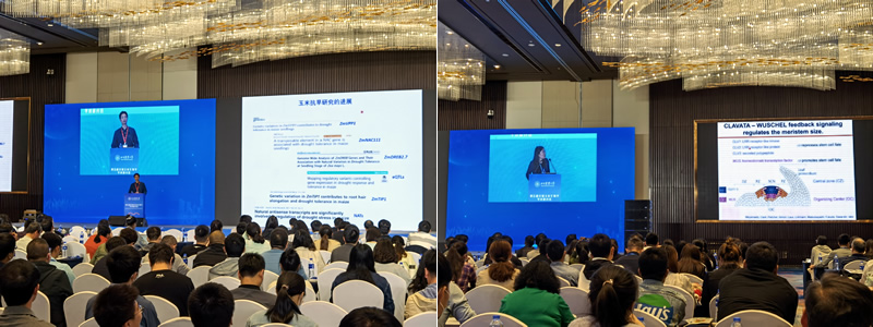 四川農(nóng)業(yè)大學(xué)校長吳德出席開幕式并致辭,他向與會專家介紹了四川農(nóng)業(yè)大學(xué)的基本情況,展望了玉米產(chǎn)業(yè)在“產(chǎn)量要更高、科技要更強、農(nóng)民要更富”3個背景下的新一輪發(fā)展機遇,希望通過此次會議,充分展示我國玉米、作物乃至植物研究領(lǐng)域的新理論成果,成為作物生物學(xué)研究領(lǐng)域?qū)<液蛯W(xué)者加強溝通、相互學(xué)習(xí)、攜手進步的盛會。同時,祝愿與會專家學(xué)者在學(xué)科前沿、基礎(chǔ)理論、引領(lǐng)技術(shù)等方面取得新的更大突破,共同為我國糧食安全和現(xiàn)代農(nóng)業(yè)發(fā)展貢獻自己的智慧和力量。圍繞玉米復(fù)雜農(nóng)藝性狀遺傳與發(fā)育、應(yīng)答生物與非生物脅迫、基因組與表觀遺傳、分子育種理論與方法技術(shù)四個主題,組委會邀請了中國農(nóng)科院萬建民院士、中國科學(xué)院分子植物卓越中心林鴻宣院士、中國農(nóng)業(yè)大學(xué)陳紹江教授、中科院上海植物生理生態(tài)研究所王二濤研究員做大會報告,還邀請了美國科學(xué)院院士、蘇里大學(xué)的James A. Birchler教授和美國科學(xué)院院士、加州大學(xué)伯克利分校Michael Freeling教授做線上報告。同時,組委會從收集的221份會議摘要中遴選了22個邀請報告和13個研究生(青年教師)交流報告,并對156份學(xué)術(shù)墻報安排時間進行專項交流。大會評選優(yōu)秀報告獎10名和墻報獎24個。本次會議集中反映了我國玉米科學(xué)基礎(chǔ)研究的新成果,介紹了國內(nèi)外玉米研究的新進展,給參會代表帶來了研究的新思路與新方向,達到了促進玉米科研工作者加強理論創(chuàng)新、人才培養(yǎng)與合作交流的目的。