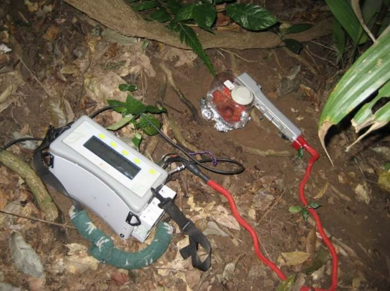 使用LCPro光合儀和SRS 1000土壤呼吸附件的測量方式。如右上角所示,一個透明的測量室被牢固地放置在寄生花上,并用鋁箔密封。該室包含一個風扇和空氣溫度傳感器;手柄具有用于測量CO2和水蒸氣濃度的紅外氣體分析器。一根紅色的線纜將測量數(shù)據(jù)連接到帶有電池、顯示屏和微處理器的控制臺。后者自動控制測量室內的參數(shù),并進行呼吸和蒸騰的計算。專用傳感器(未顯示)測量環(huán)境空氣溫度和濕度以及空氣壓力。