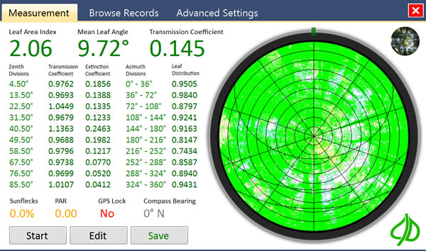 新的CI-110分析軟件不僅可顯示PAR光合儀有效輻射、Sunfleck值、GPS信息,還可以進(jìn)行天頂角和方位角的分區(qū),可以獲得不同區(qū)域內(nèi)的太陽(yáng)直接輻射、消光系數(shù)、葉片的方位分布等參數(shù)。
