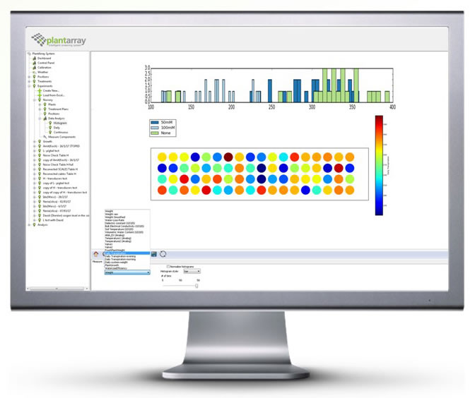 以色列Plant-DiTech公司的Plantarray監(jiān)測(cè)系統(tǒng)是一套高通量,以植物生理學(xué)為基礎(chǔ)的高精度表型系統(tǒng),可以完成整個(gè)植物生長(zhǎng)周期中不同環(huán)境下的SPAC(Soil-Plant-Atmosphere Continuum, 土壤植物大氣連續(xù)體)因子的測(cè)量。連續(xù)不間斷的獲取陣列內(nèi)所有植物的監(jiān)測(cè)數(shù)據(jù),實(shí)時(shí)監(jiān)控和及時(shí)調(diào)整每個(gè)培養(yǎng)容器中的土壤條件,包含土壤水分、鹽分。